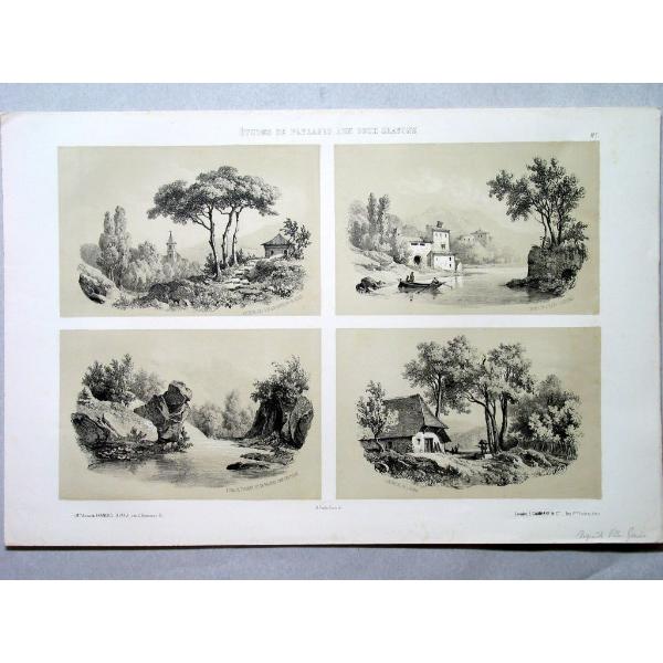 Etudes de paysages aux deux Crayons (Due vedute: dintorni di Roma, il fiume Isère, torrente ai Vosges, dintorni di Lione)