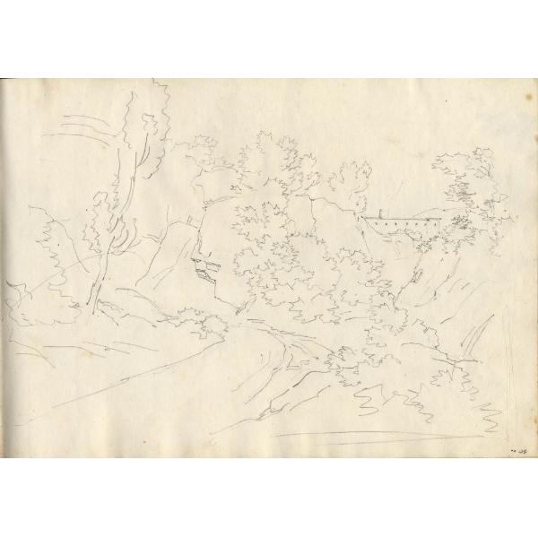 Paesaggio boscoso con edificio