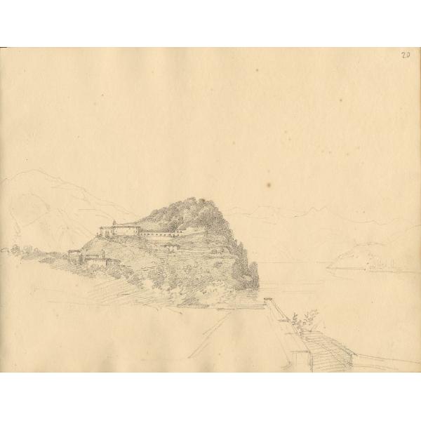 Paesaggio lacustre con colle boscoso e convento