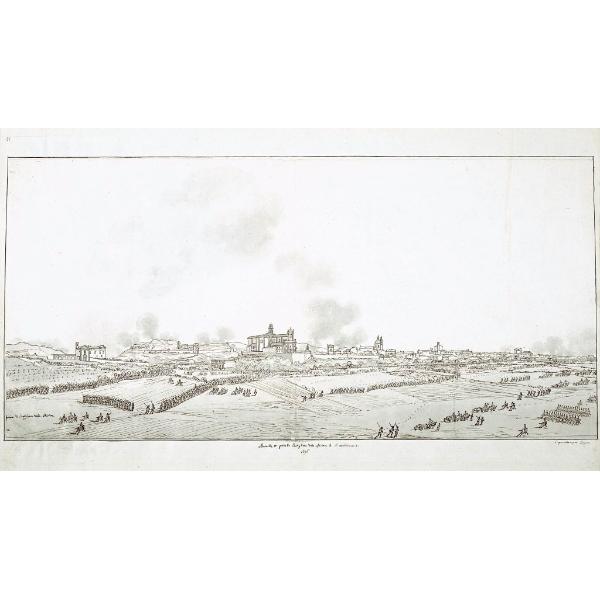 penna bruna, inchiostro a pennello, tracce di matita, punti ad acquarello rossi e blu ad indicare la dislocazione delle truppe