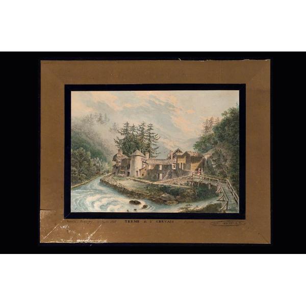 Viaggio di Savoia-Faucigny. Terme di Saint Gervais con caseggiati rustici in parte diroccati e macchiette