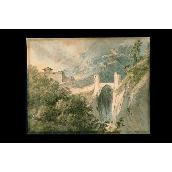 Ponte ad arco ogivale, sospeso su burrone, con torri rotonde ai due lati e grande castello sullo sfondo