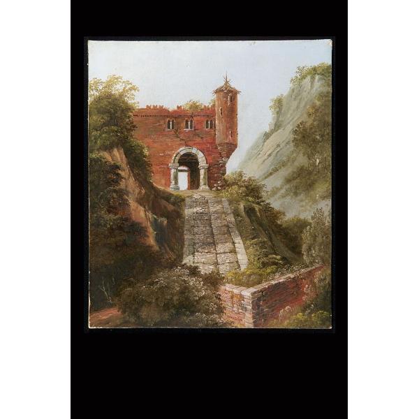 Castello gotico con piccola torre angolare e tre bifore sull'arcone d'ingresso