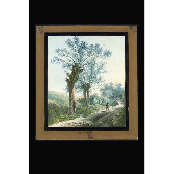 Strada serpeggiante con filare d'alberi e figura di vecchio