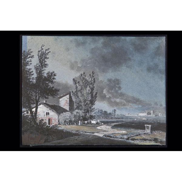 Campagna con edificio colonico tra alberi e donna che stende il bucato