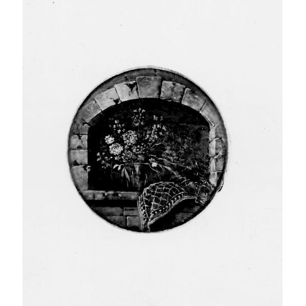 Medaglione con veduta di finestra adorna di un vaso di fiori e di un drappo rosso sul davanzale