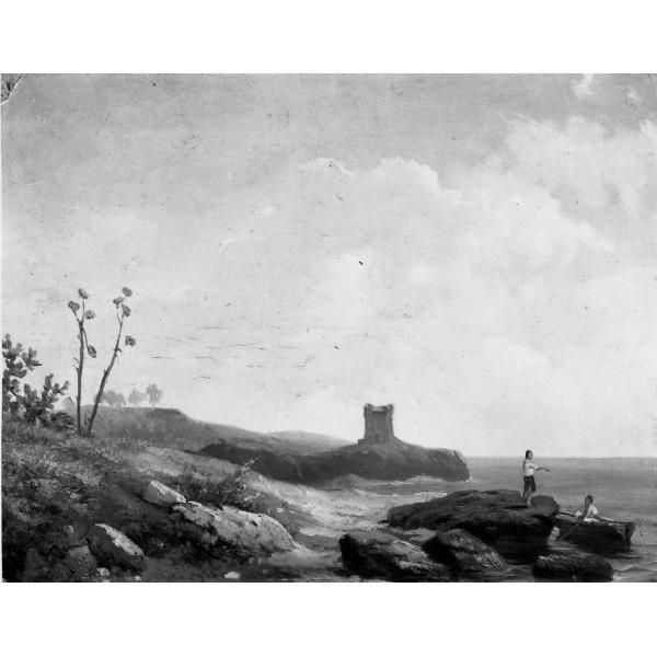Spiaggia con barchetta e due pescatori: molo con t