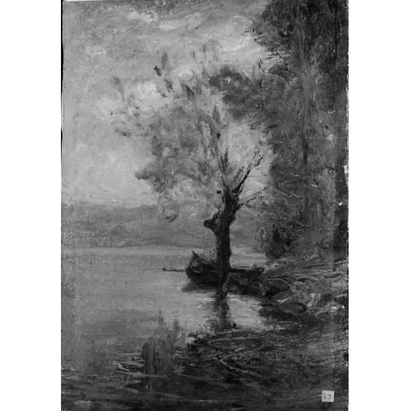 Laghetto e monti: riva con alberi e barca