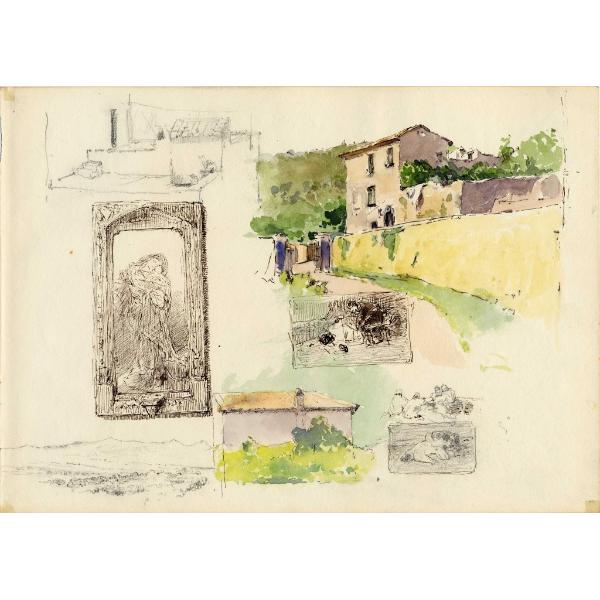 matita, penna, inchiostro bruno a pennello e acquerello su carta bianca