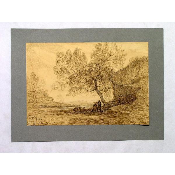 Due contadine conversanti sotto un grande albero