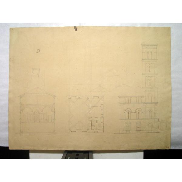 Chiesa di S. Gioachino - Prospetto esterno, pianta e sezione della sacrestia
