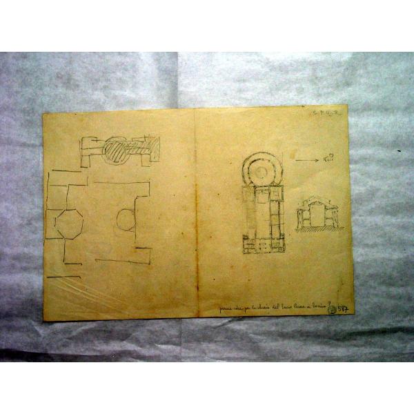 Pianta e schizzi di edificio religioso (Chiesa del Sacro Cuore in Torino ?)