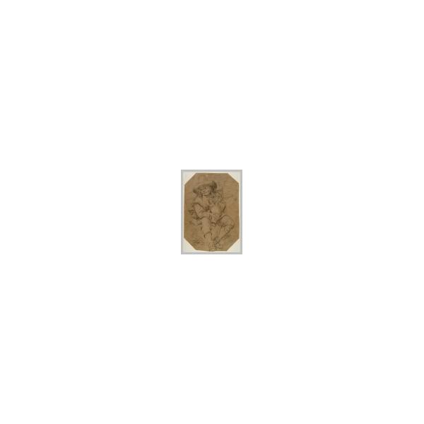GIOVANE UOMO SEDUTO CON UN CESTO SULLE SPALLE E UNA BROCCA IN MANO