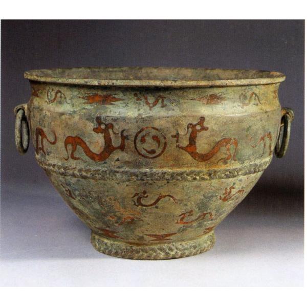 bronzo fuso in matrici/ applicazioni in lamina di rame rosso. L'apparente assenza dell'incasso per l'intarsio delle lamine suggerisce che esse siano state fatte aderire a caldo sulla superficie dell'oggetto.