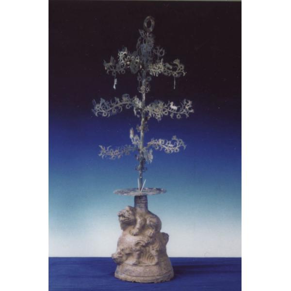 albero in bronzo parzialmente dorato/ tronco composto da tre elementi tubolari/ ramificazioni fuse in matrici piane. Supporto in terracotta grigia/ realizzato con due stampi giustapposti/ con tracce di pigmenti.