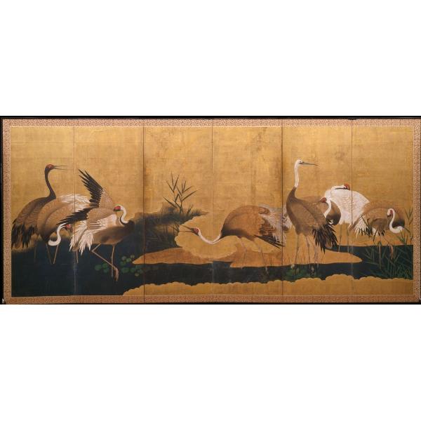 Inchiostro/ tempera e 'gofun' su foglia d'oro/ supporto di carta. Montatura su struttura in legno laccato con borchie metalliche/ bordo di seta damascata.