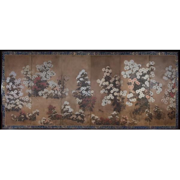 Inchiostro/ tempera e 'gofun' su carta. Montatura su struttura in legno laccato con borchie metalliche/ bordo di seta damascata.