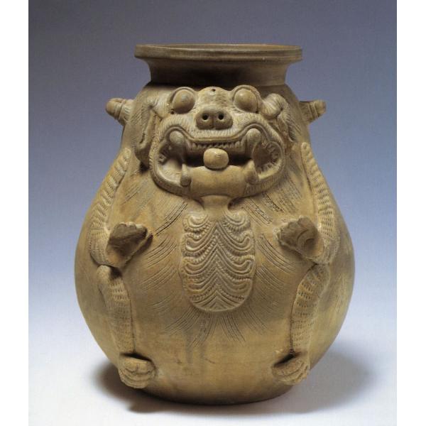 Gres porcellanoso grigio chiaro con coperta verde-gialla. Lavorazione al tornio/ elementi applicati.
