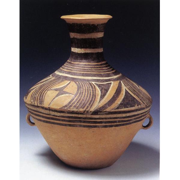 Terracotta arancione con decorazione dipinta in nero e bianco. Corpo lavorato a cercine/ collo applicato rifinito al tornio.