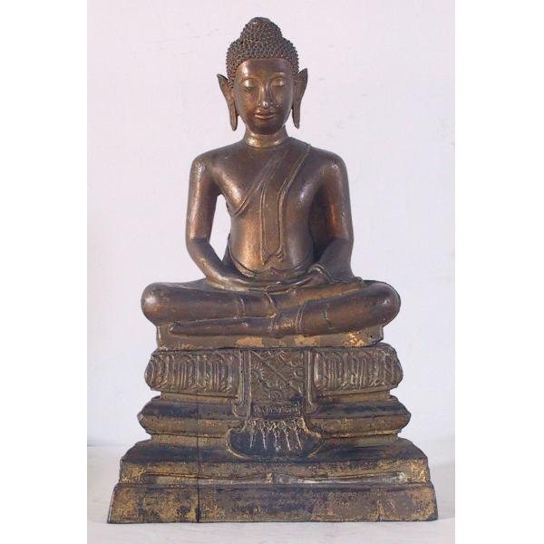bronzo a patina rameica con tracce di doratura e pigmenti/ base (non originale) in legno dorato con pittura rossa.