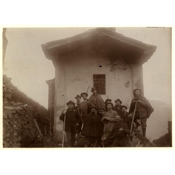 GITA SOCIALE DEL C.A.I. AL PIAN DELL'ORSO. VALLE DI SUSA, GRUPPO DI ESCURSIONISTI DEL CLUB ALPINO ITALIANO A PIAN DELL'ORSO, DAVANTI ALLA CAPPELLA