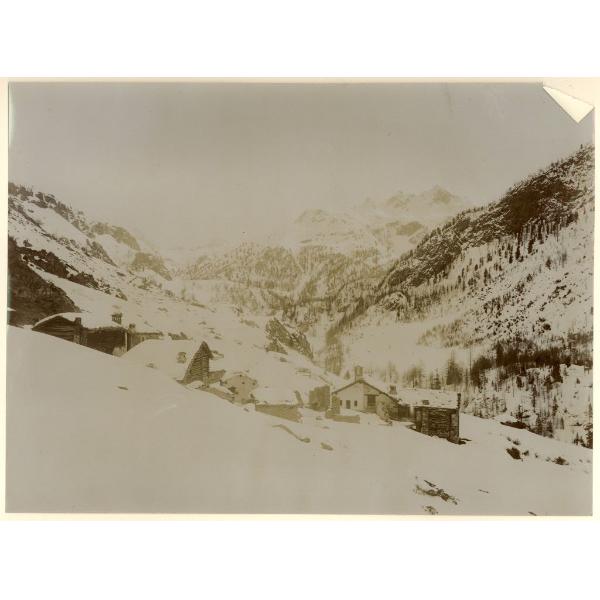 VALLE DI COGNE, PAESAGGIO INVERNALE CON ALCUNE BAITE SEMIDIROCCATE IN PRIMO PIANO