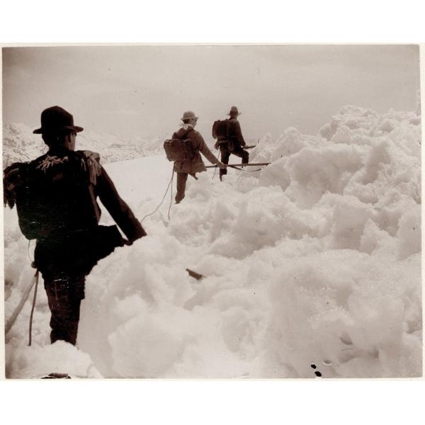 TRAVERSANDO UNA VALANGA. VALLE DI SUSA, PUNTA FERRAND (?), ALPINISTI DURANTE LA TRAVERSATA DI UNA VALANGA