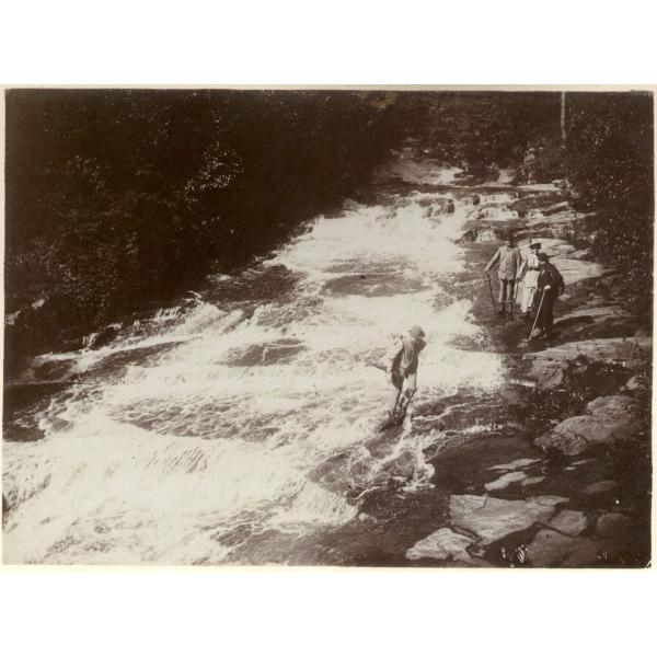 TORRENTE PRESSO BROSSO. VAL CHIUSELLA, BROSSO, ESCURSIONISTI SULLA SPONDA DI UN TORRENTE