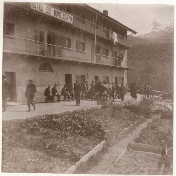 ALL'HOTEL DU MONT CERVIN. VALLE DI AOSTA/ VALTOURNENCHE, BREUIL, VILLEGGIANTI ED ESCURSIONISTI DAVANTI ALL'HOTEL DU MONT CERVIN