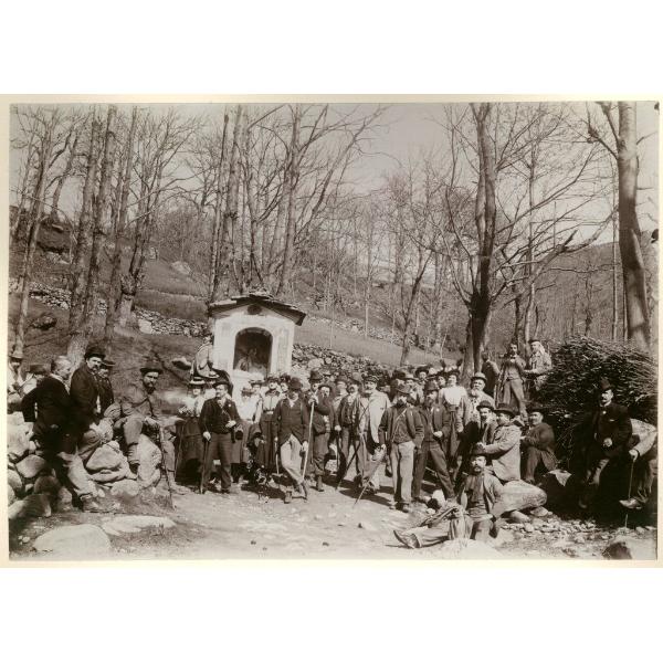 UN ALT NEL BOSCO DI. VALLE DEL SANGONE/ LOCALITA' NON IDENTIFICATA/ ESCURSIONISTI IN POSA NEL BOSCO PRESSO UN PILONE VOTIVO