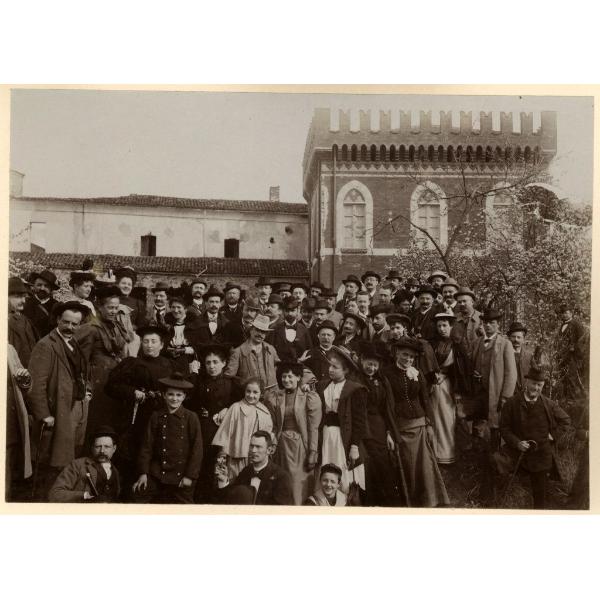 NEL CASTELLO DI CASTELLAMONTE. PIEMONTE, CASTELLAMONTE, GRANDE GRUPPO DI ESCURSIONISTI IN POSA NEL CORTILE DEL COSIDDETTO CASTELLO