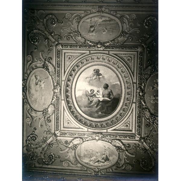TORINO/ PALAZZO NOVECENTESCO NON IDENTIFICATO (VILLA MASSARA?), VISTA ZENITALE DI VOLTA A PADIGLIONE CON TONDO CENTRALE RAPPRESENTANTE L'ARCHITETTO CHE RICEVE L'ALLORO E TONDI IN STUCCO RAFFIGURANTI MESTIERI.