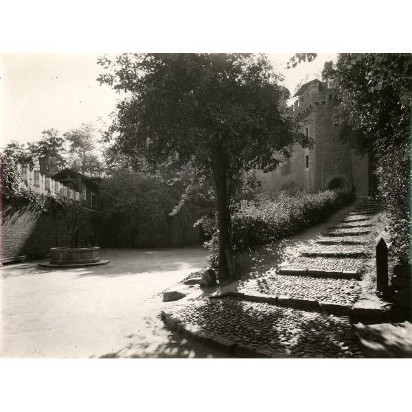TORINO/ BORGO MEDIEVALE, PIAZZALE VISTO DA NORD CON LA RAMPA DI ACCESSO ALLA ROCCA E LA FONTANA DEL MELOGRANO