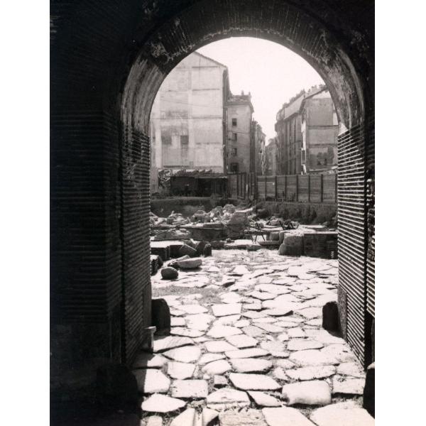 DA/ TORRI PALATINE. TORINO/ PORTA PALATINA, PIAZZA CESARE AUGUSTO, VEDUTA DELL'AREA DA NORD ATTRAVERSO IL FORNICE OCCIDENTALE DURANTE I LAVORI DI SISTEMAZIONE, CON VIA PORTA PALATINA SULLO SFONDO