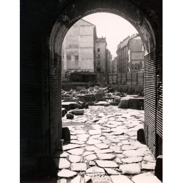 TORINO/ PORTA PALATINA, PIAZZA CESARE AUGUSTO, VEDUTA DELL'AREA DA NORD ATTRAVERSO IL FORNICE OCCIDENTALE DURANTE I LAVORI DI SISTEMAZIONE, CON VIA PORTA PALATINA SULLO SFONDO