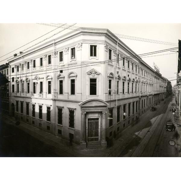 TORINO/ PALAZZO DELLA ESATTORIA COMUNALE E PALAZZO DELLA CASSA DI RISPARMIO, VIA XX SETTEMBRE ANGOLO VIA ARCIVESCOVADO, VISTA ANGOLARE DA SUD SULL'INGRESSO PRICIPALE