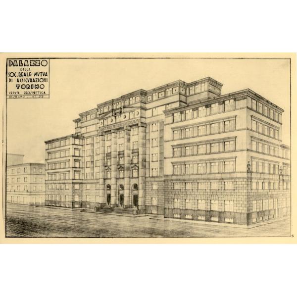GABINIO MARIO, TORINO/ PALAZZO DELLA REALE MUTUA ASSICURAZIONI, VIA CORTE D'APPELLO 11, RIPRODUZIONE DELLA TAVOLA PALAZZO/ DELLA/ SOC.REALE MUTUA/ DI ASSICURAZIONI/ TORINO/ VEDUTA PROSPETTICA/ DISEGNO N.33