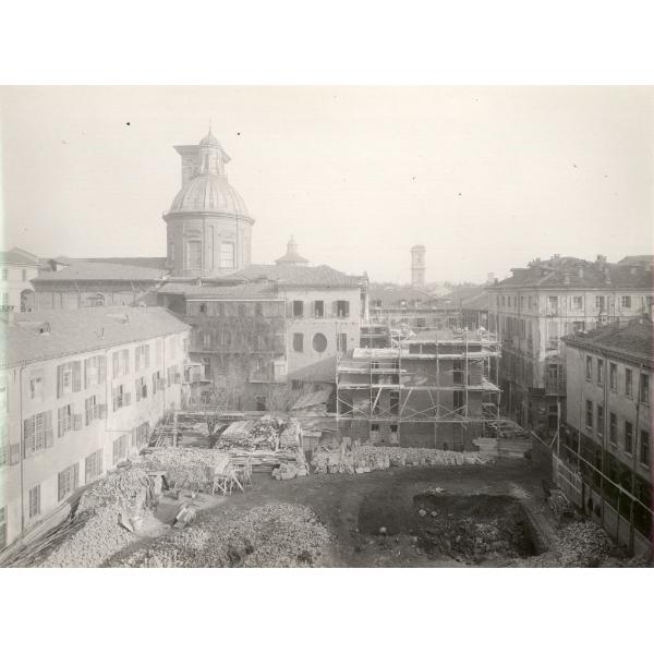 TORINO/ CANTIERE DEL PALAZZO DEI SERVIZI DEMOGRAFICI, VIA BARBAROUX, VISTA DA OVEST, DA VIA STAMPATORI, CON LA CUPOLA DELLA CHIESA DEI SANTI MARTIRI