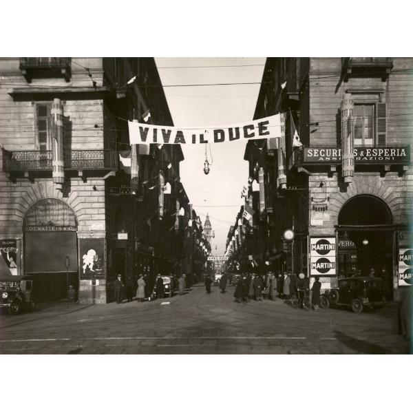TORINO/ PIAZZA CARLO FELICE, VISTA VERSO NORD IN ASSE A VIA ROMA CON BANDIERE E STRISCIONI PER LA VISITA DI MUSSOLINI
