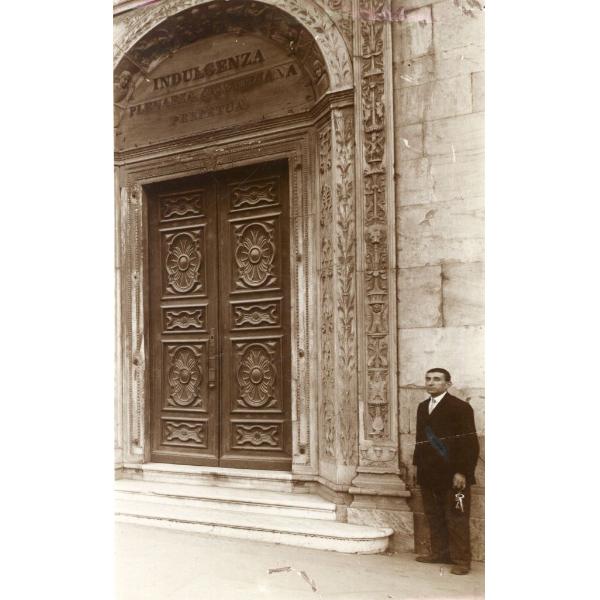 TORINO/ DUOMO, PIAZZA SAN GIOVANNI, PROSPETTO PRINCIPALE, PORTALE DESTRO CON ACCANTO UN UOMO CON UN MAZZO DI CHIAVI