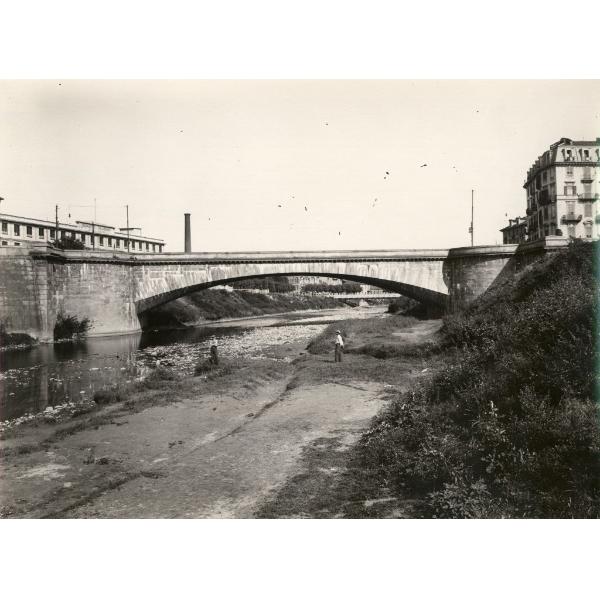 TORINO/ PONTE MOSCA SULLA DORA RIPARIA, CORSO GIULIO CESARE, VISTA DA NORD OVEST DALL'ARGINE CON DUE UOMINI SULLA SPONDA