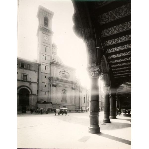 TORINO/ VIA PIETRO MICCA, VISTA DI SCORCIO DAI PORTICI SETTENTRIONALI COL FIANCO DELLA CHIESA DI SAN TOMMASO IN SECONDO PIANO