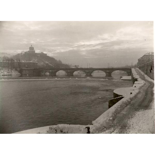 TORINO/ MURAZZI DI LUNGO PO CADORNA, VISTA DI SCORCIO VERSO SUD CON LA NEVE. IN SECONDO PIANO PONTE VITTORIO EMANUELE I. SULLO SFONDO LA CHIESA DI SANTA MARIA AL MONTE DEI CAPPUCCINI