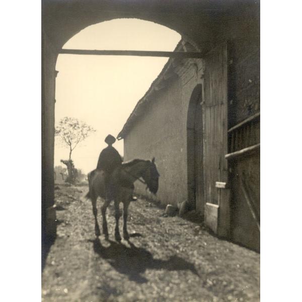 COLLEGNO?, UOMO A CAVALLO SOTTO L'ANDRONE DI UNA IN CASCINA. RIPRESA IN CONTROLUCE