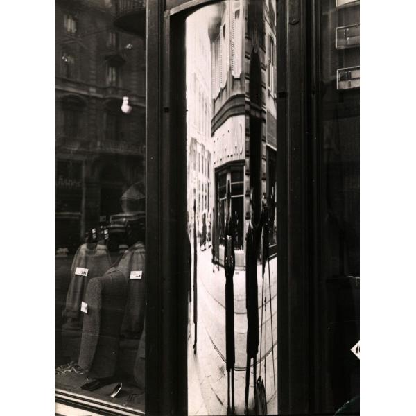 TORINO/ GABINIO ALLA MACCHINA FOTOGRAFICA RIFLESSO NEL VETRO CURVO DI UN NEGOZIO IN PIAZZA C.L.N.