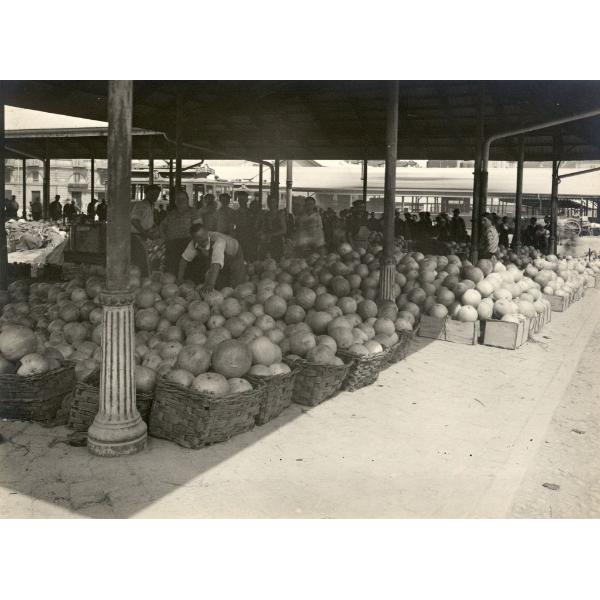 TORINO/ MERCATO DI PORTA PALAZZO, VENDITORE CON GRANDI CESTE DI ANGURIE SOTTO UNA TETTOIA