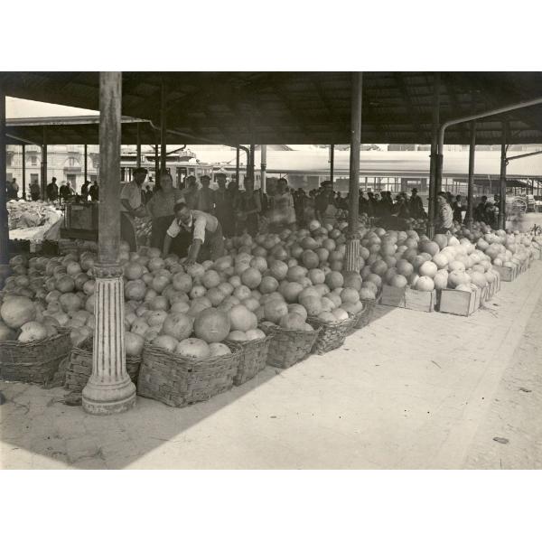 SIG. MACARIO GIUSEPPE. TORINO/ MERCATO DI PORTA PALAZZO, VENDITORE CON GRANDI CESTE DI ANGURIE SOTTO UNA TETTOIA