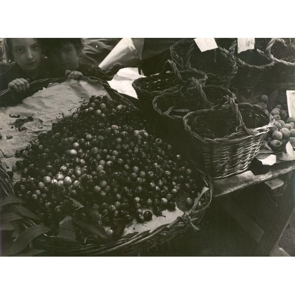 TORINO/ MERCATO DI PORTA PALAZZO?, CESTA DI CILIEGIE SU DI UNA BANCARELLA CON DUE BAMBINE CHE OSSERVANO IL FOTOGRAFO