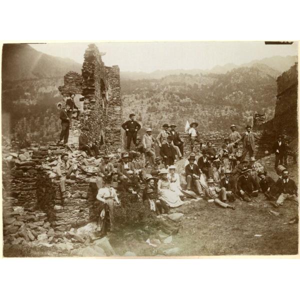 SUI RUDERI DI MONTJOVET. MONTJOVET, GRUPPO DI ESCURSIONISTI DURANTE LA SOSTA TRA I RUDERI DEL CASTELLO