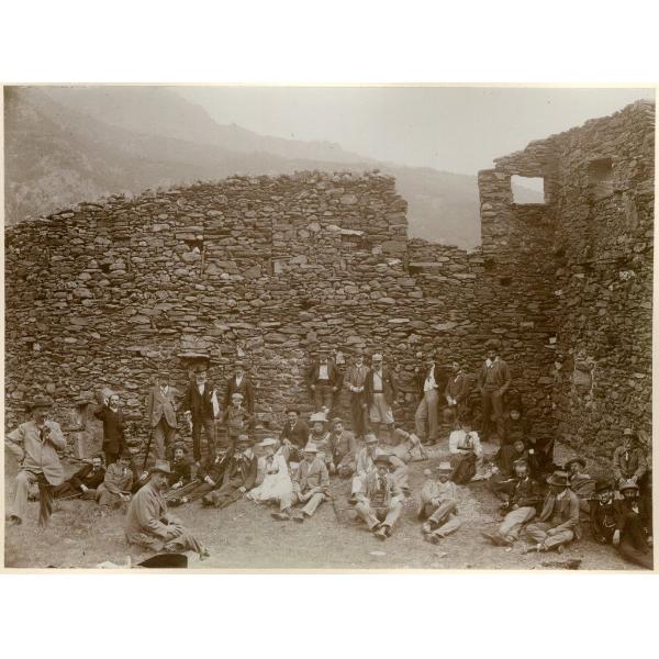 NEI RUDERI DI MONTJOVET. MONTJOVET, GRUPPO DI ESCURSIONISTI DURANTE LA SOSTA TRA I RUDERI DEL CASTELLO
